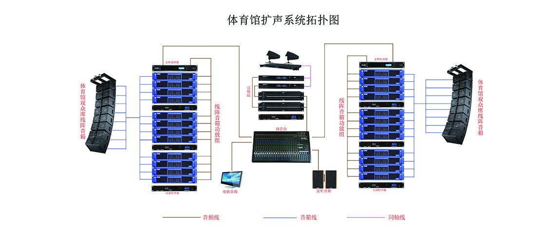 場地擴(kuò)聲采用分散擴(kuò)聲式布置,觀眾席的分布采用集中擴(kuò)聲式布置,主席臺采用流動的擴(kuò)聲方式。擴(kuò)聲系統(tǒng)的設(shè)備主要分為六部份:擴(kuò)聲設(shè)備、處理設(shè)備、功放設(shè)備、調(diào)音臺設(shè)備、周邊處理器及音源設(shè)備和信號拾取設(shè)備。這六個部份互相配合而成,確保在使用時效果理想,操控容易,減低出錯機(jī)會,且能在極短的設(shè)定時間內(nèi)便能應(yīng)付任何變化的需要。